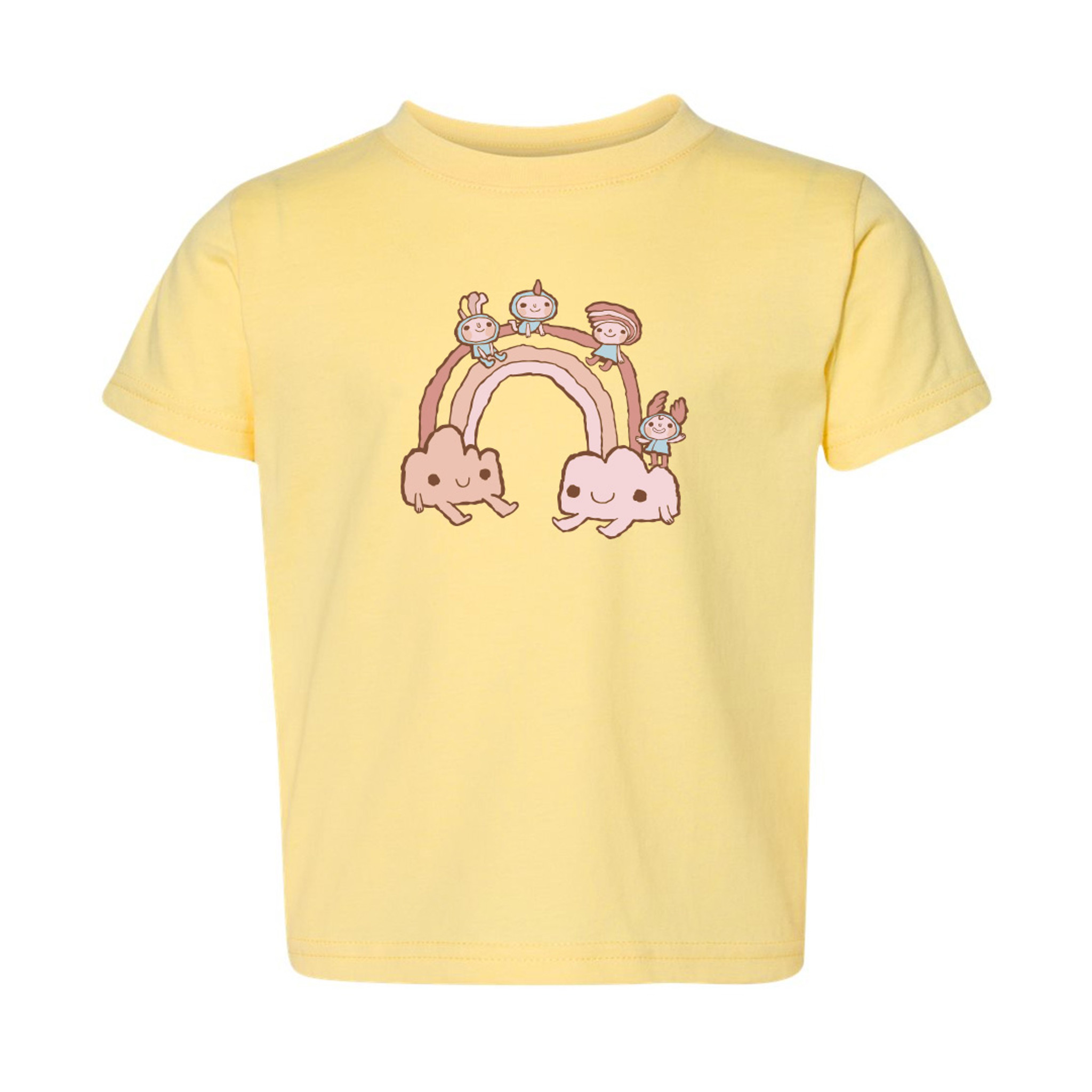 Multi colored screen printed design on Rabbit Skins Butter color jersey fine cotton tee.