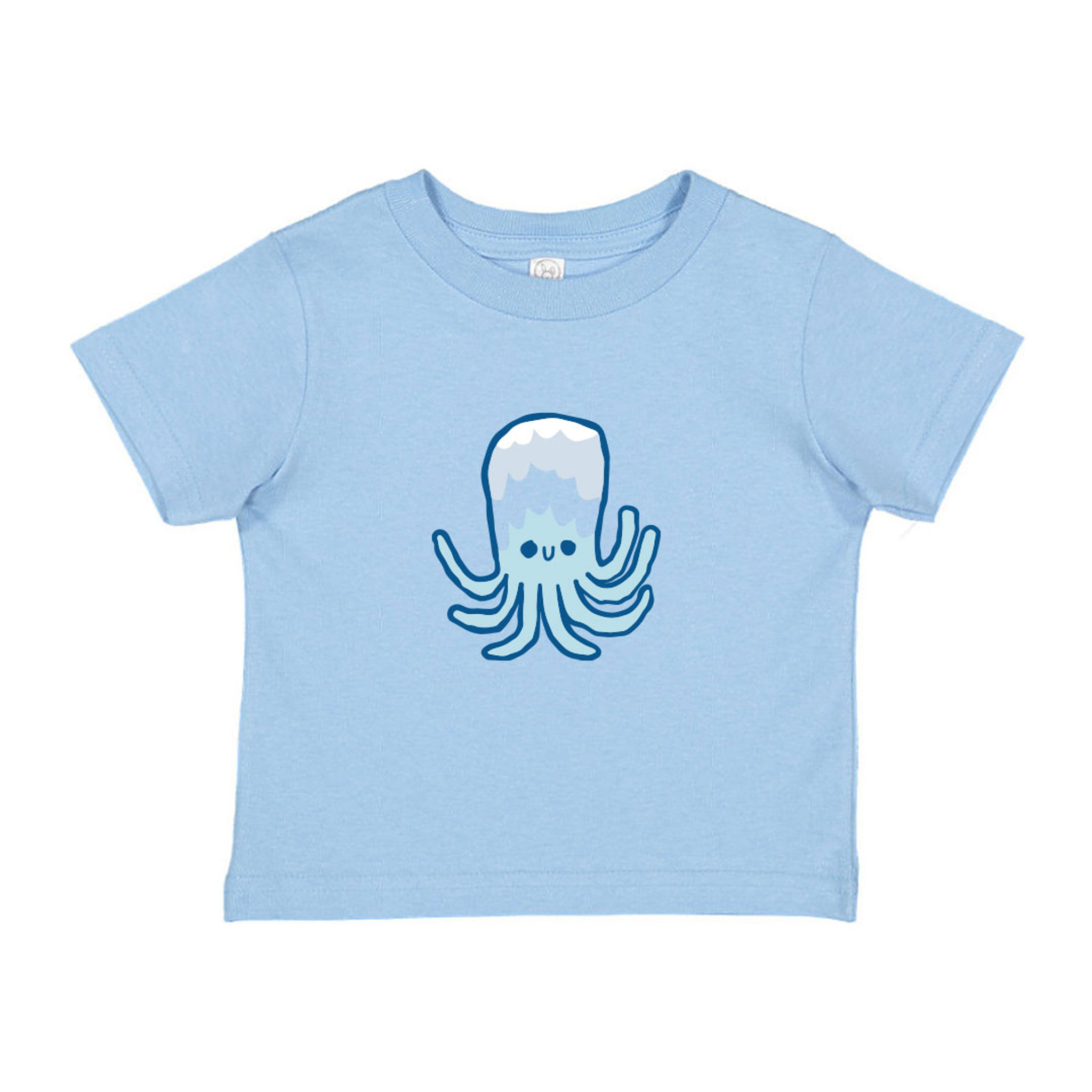 Multi colored screen printed design on Rabbit Skins Light Blue color jersey fine cotton tee.