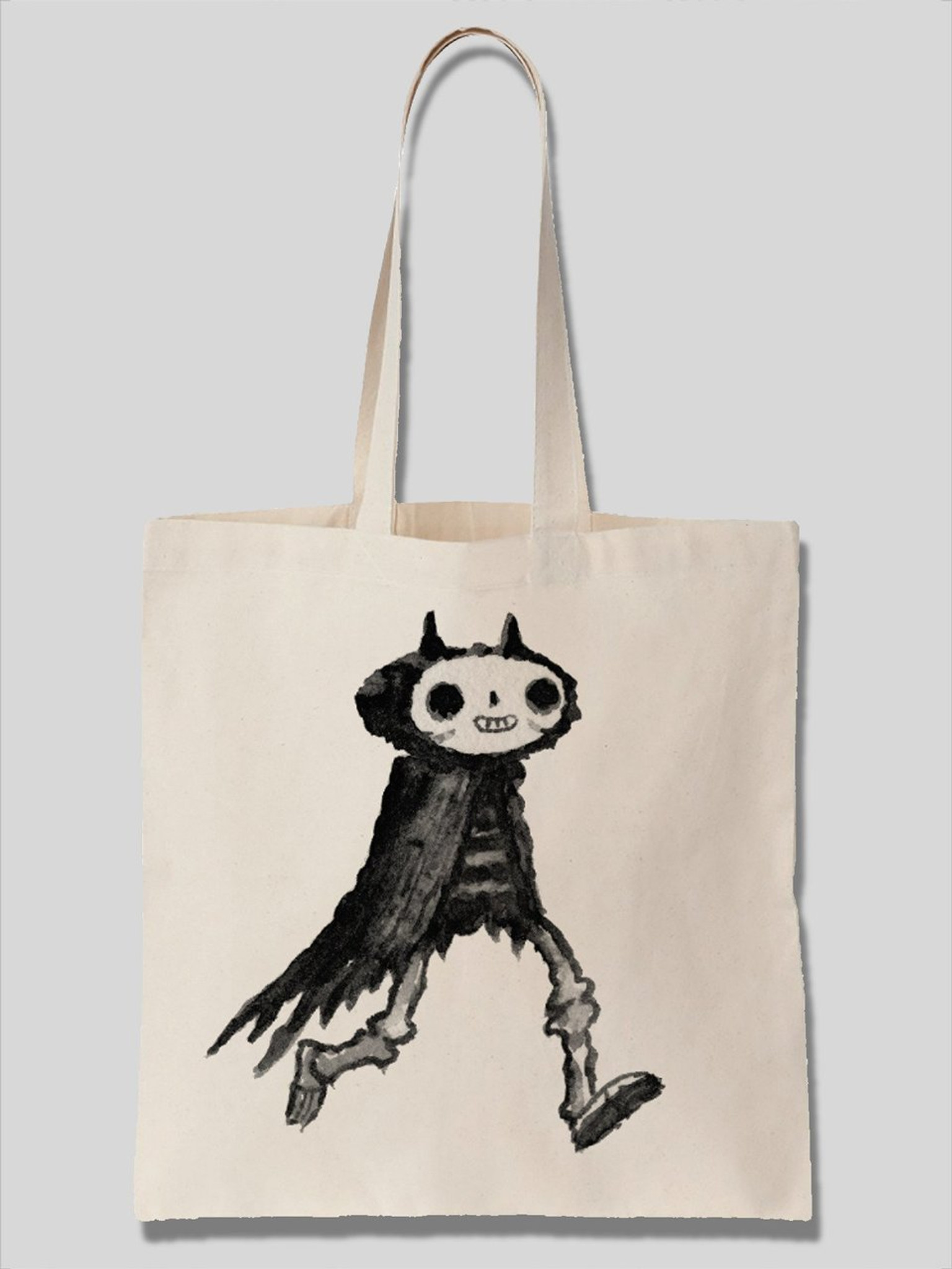 Who's this little Skeleton Devil cruisin' through?? Where is he going? Probably on the way to the local shop to pick up some books! Wouldn't it be great if you were also cruising along with this Skeleton Devil? Now you can! He's on this bag! You can carry him with you!