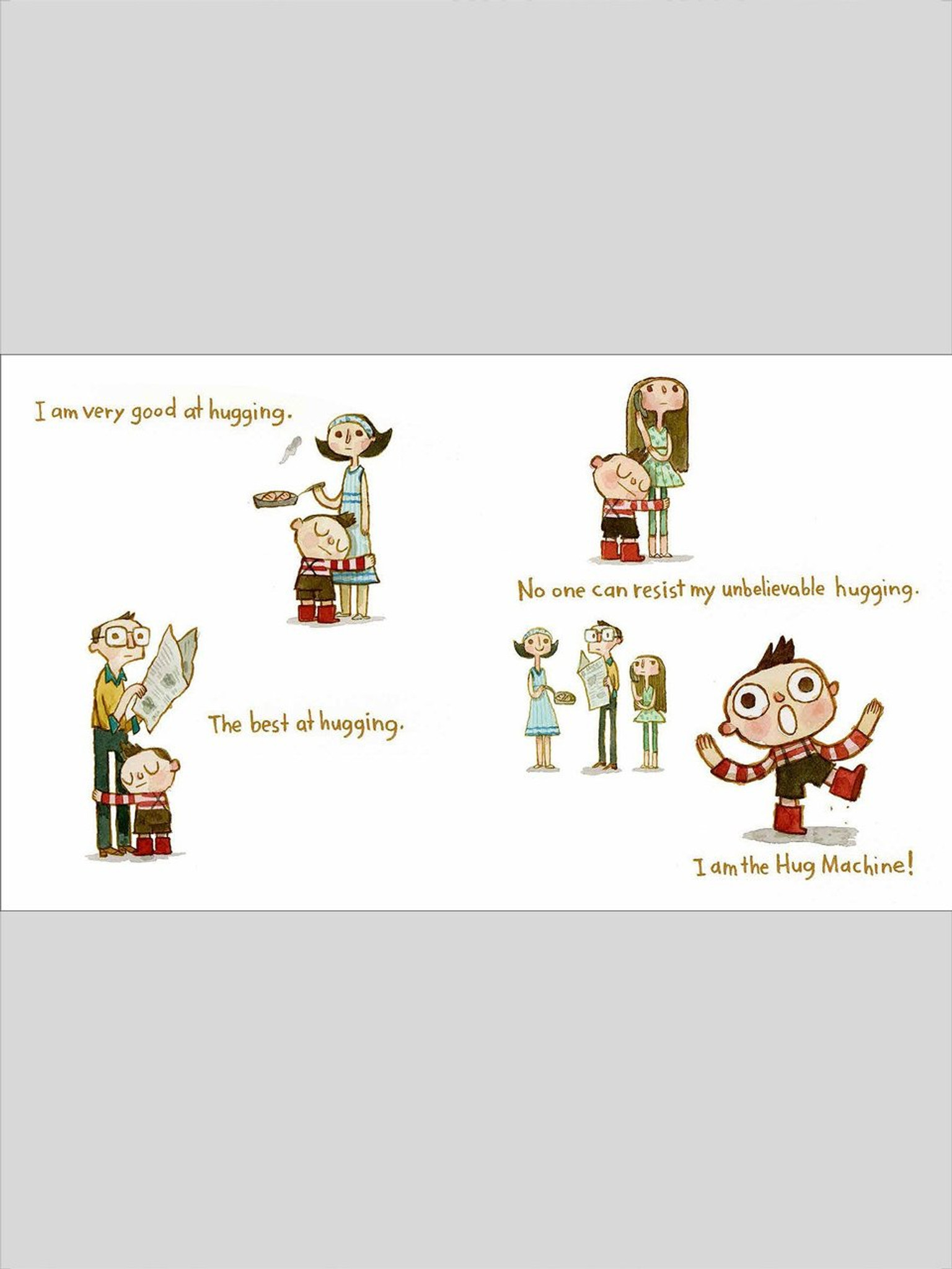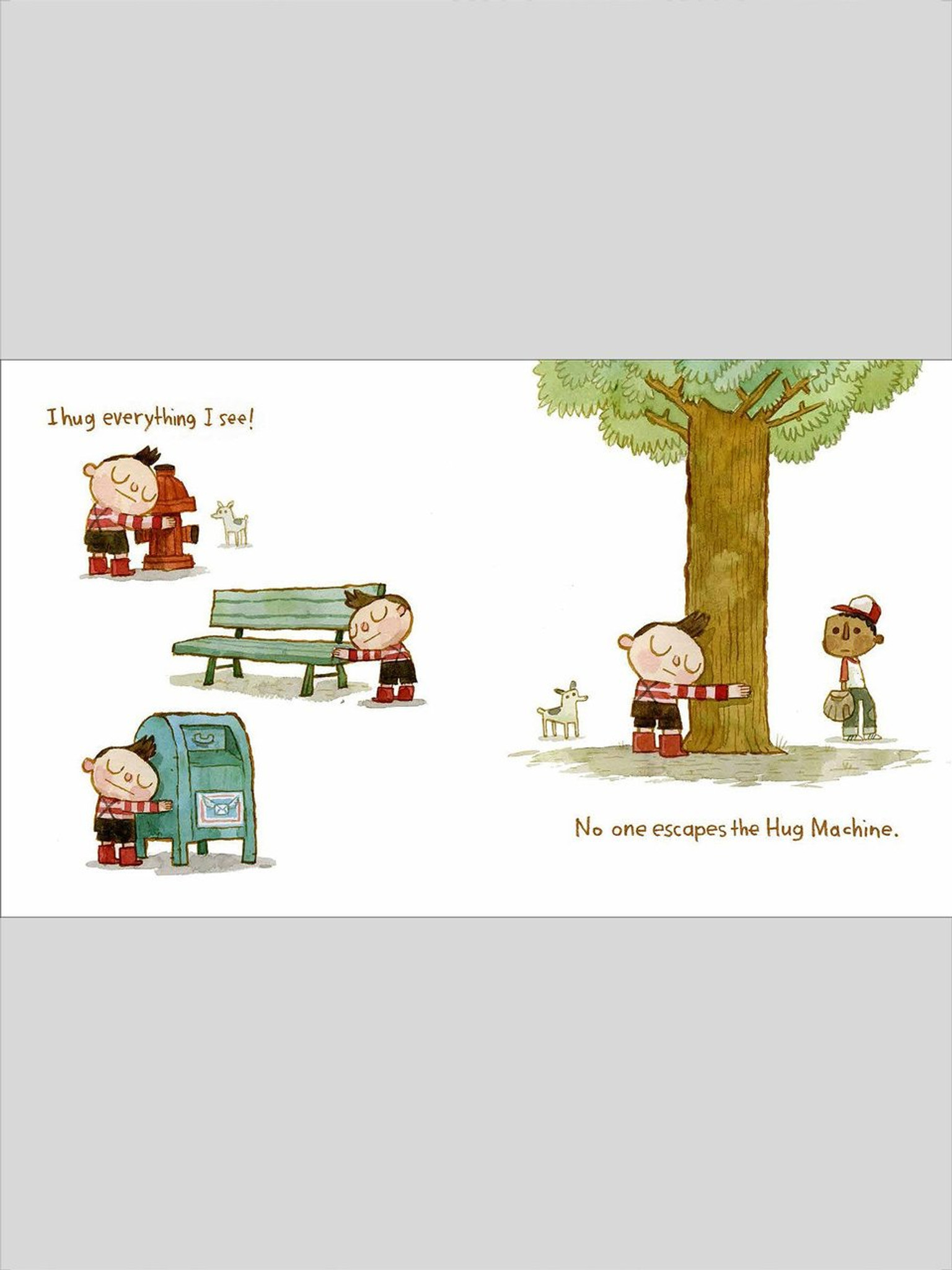 HUG MACHINE is the story of a child who is super down with hugging.  He is the self-proclaimed Hug Machine and he is very excited to tell everyone about it. He is very good at hugging and he is not shy to show the world.  He is ready for you to watch how amazing he is at hugging.  He hugs people, but he also hugs things.  Nothing escapes.  Nothing.  He even solves problems with his hugs.  Sometimes he comes up against some real tough hugs.  Hugs that would make others give right the heck up and turn away.  But the Hug Machine never backs down.  And if you, the reader, need a hug?  The Hug Machine will hug you.  Do not worry!  Everyone gets a hug.